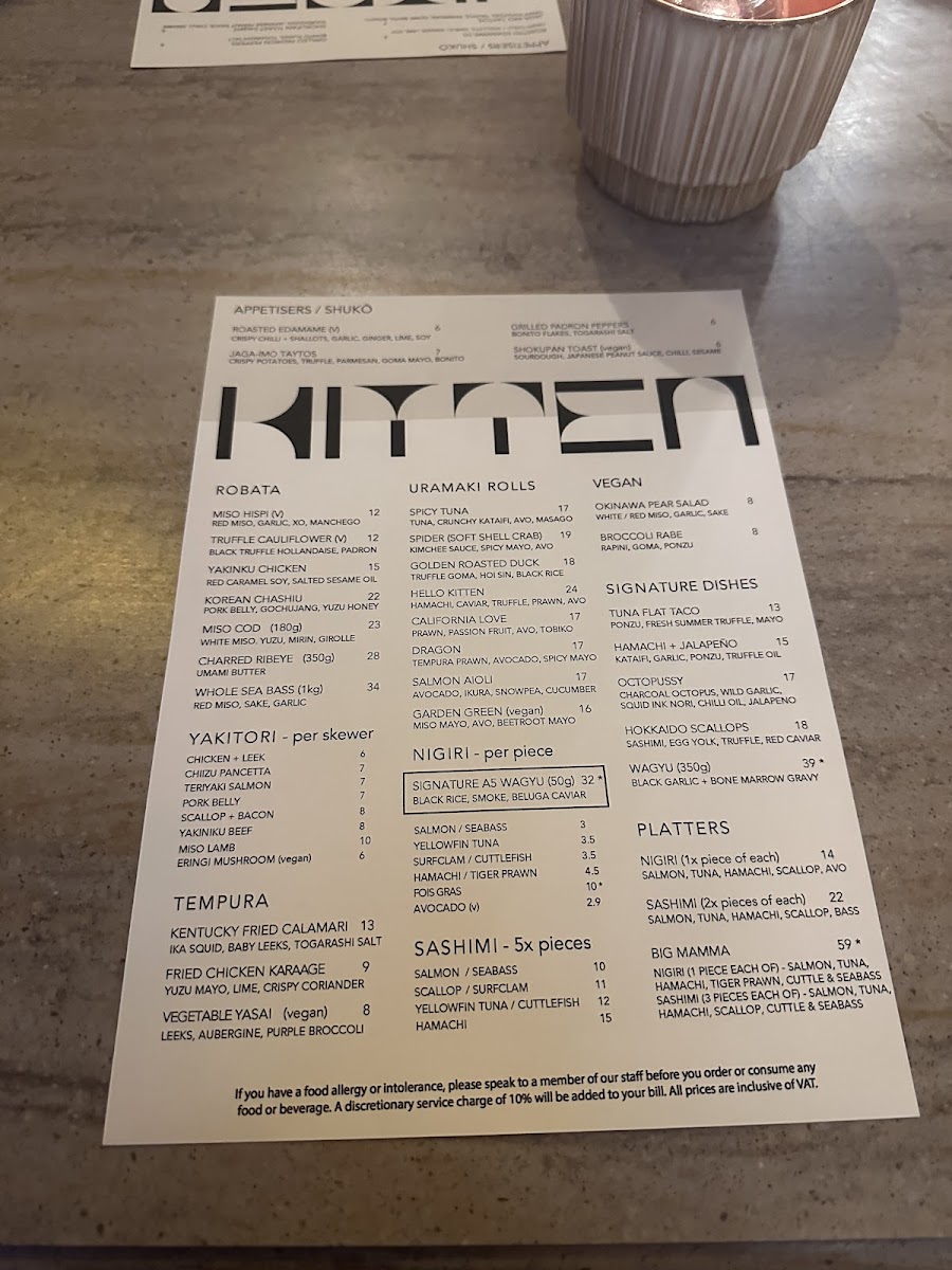 Welcome to KITTEN, a hidden gem nestled in the vibrant heart of Manchester at 9 Deansgate. This trendy yet intimate restaurant offers a menu that will delight sushi enthusiasts and casual diners alike.